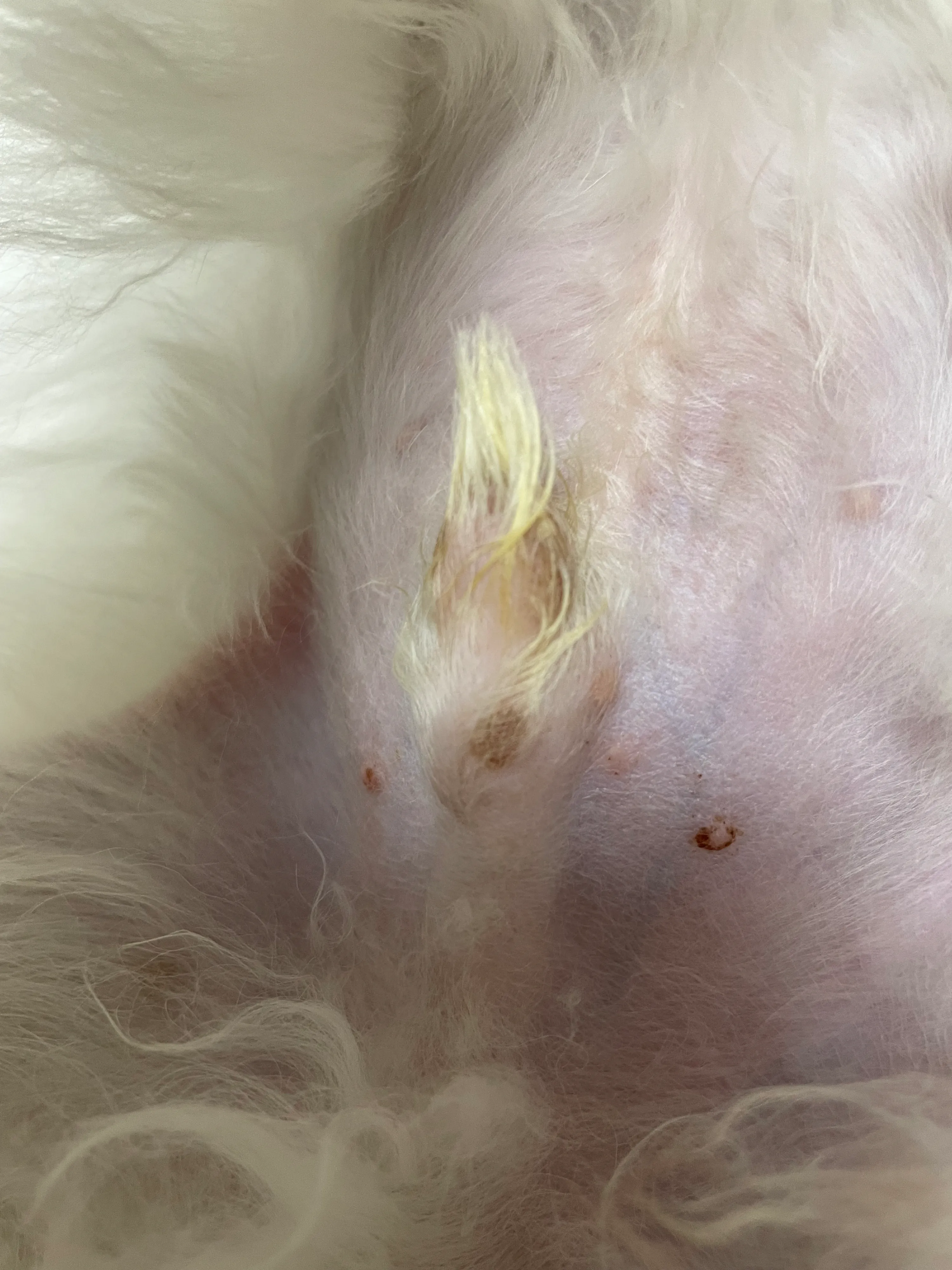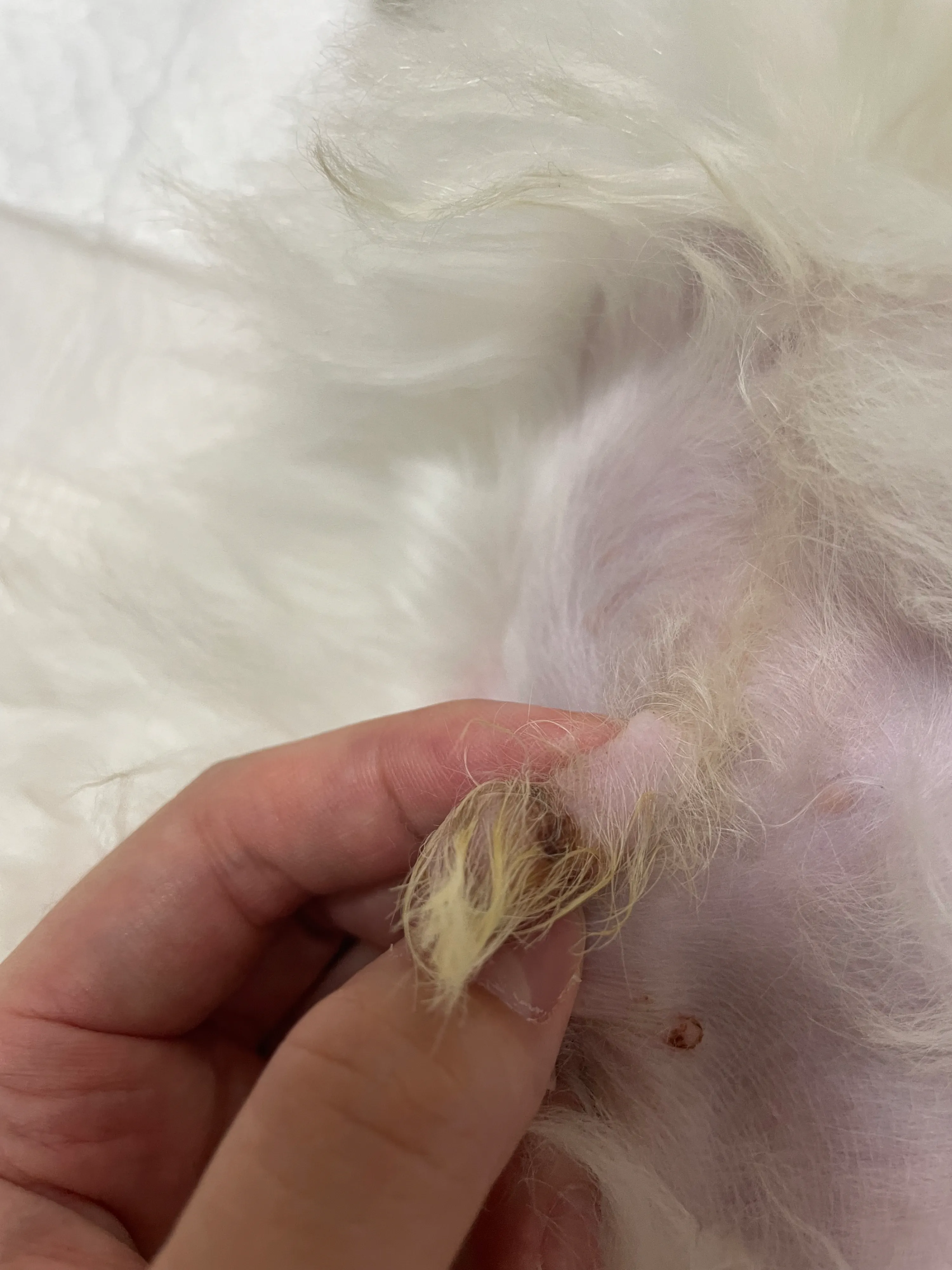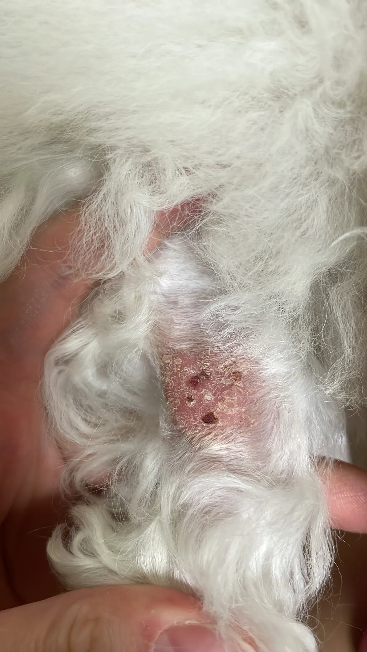 5개월 비숑 아기입니다 팔쪽에 곰팡이성 피부염 진단 받고 먹는약 복용중인데 밑에 생식기쪽에 저 염증? 은 어떤건지 병원갔을때 여쭤봤는데 별 크게 신경쓰지 않아도된다 하셔서 알겠다하고 왔는데 다음날부터 약 먹이니 팔도 더 심해지고 밑에 염증같은 부분도 더 심해진것같습니다 다른병원 가봐야할까요😭
