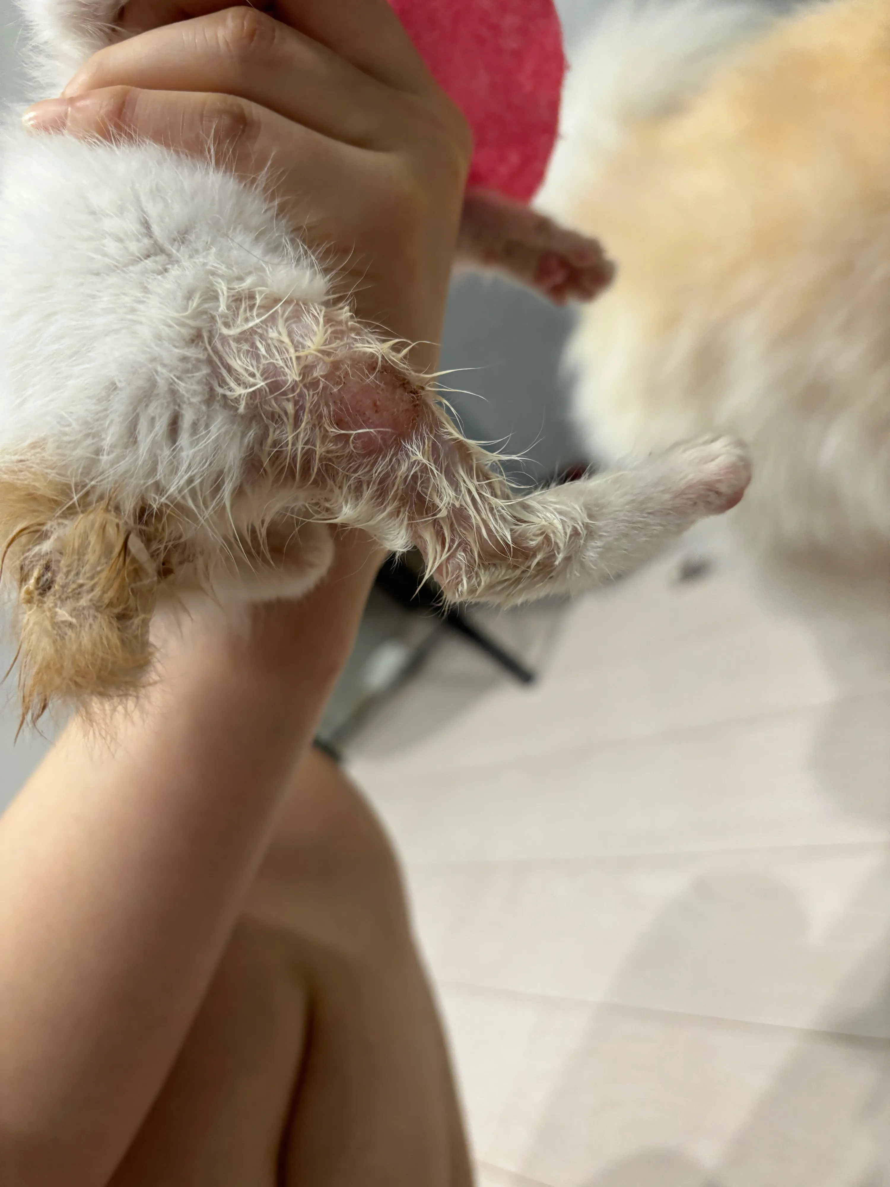 처음엔 검정 딱지가 두껍게있어서 불려서 떼어줬더니 이렇네요ㅠㅠ 주변 털도 빠지는 듯하고 ..혹시 링원일까요? 형태가 약간 다른 듯한데 .. 소독하고 터비덤 스프레이 뿌려주고있어요 어제부터 ㅠㅠ