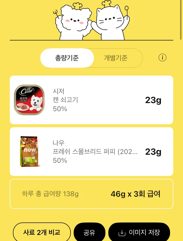 저희 강아지가 토이 푸들인데 지금 몸이 안좋아서 시저 캔에 사료를 섞어서 주고 있었어요 근데 시처 반이랑 사료 섞어서 줘도 되나요?너무 많이 주는것같아서.. 저희 강아지가 4킬로 정도 되는데 앱으로 계산 하면 25g,25g씩 주라고 나오더라고요 그렇게 주는게 맞는거죠? 그리고 급여량은 하루에 3번씩 주고 있어요 몇시간마다 줘야 하나요!!