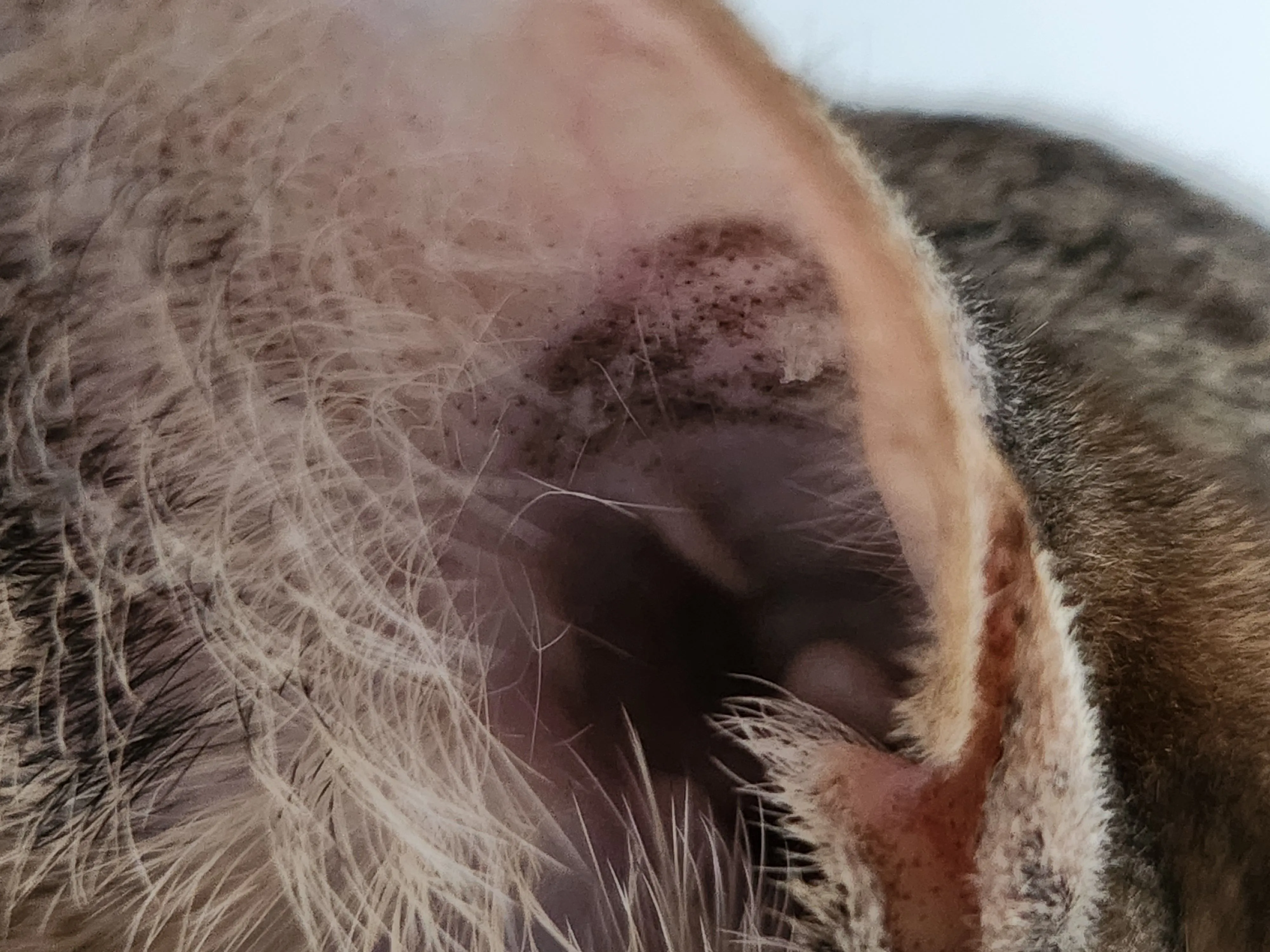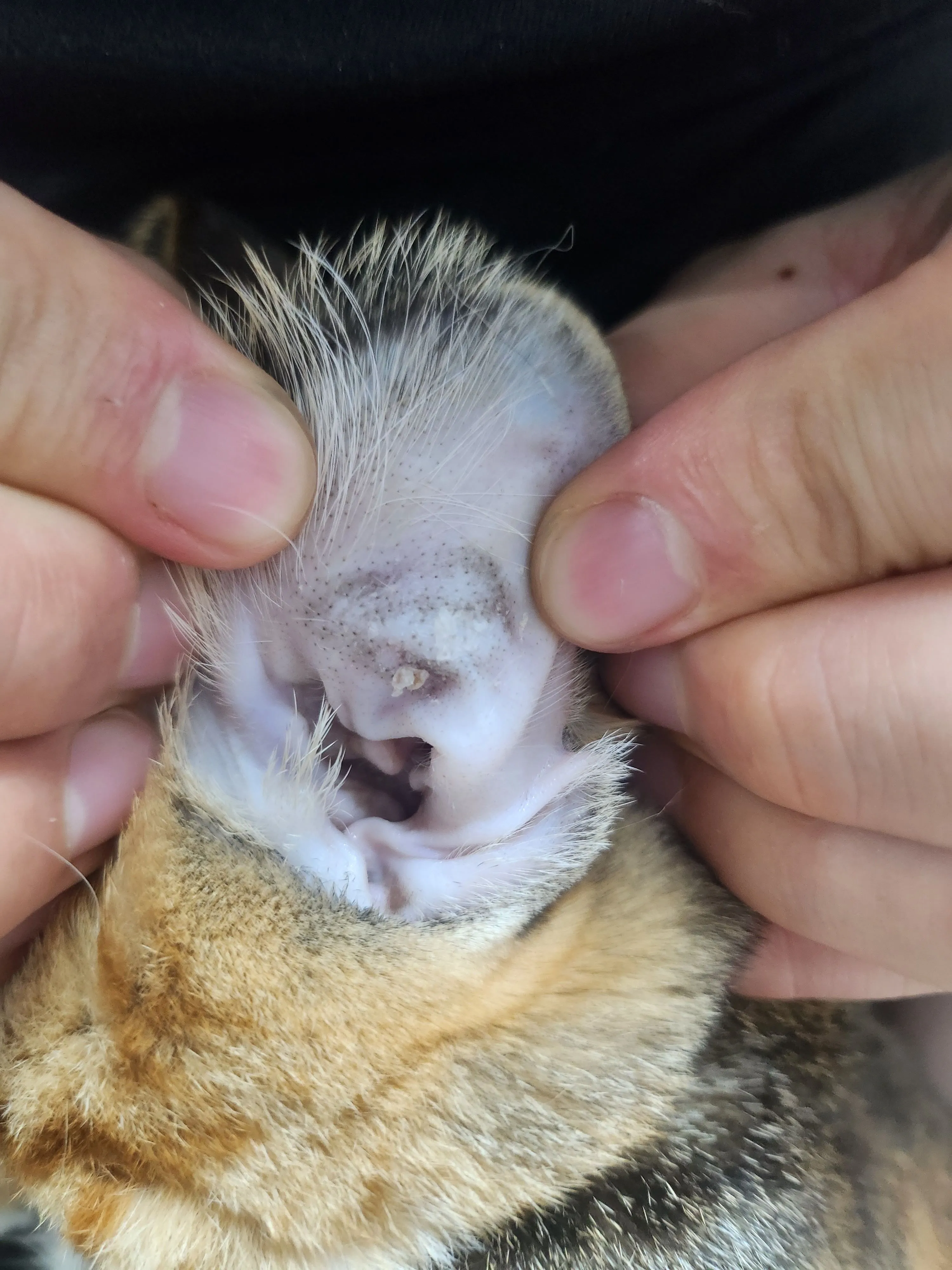 안녕하세요. 고양이가 한 달 전부터 귀를 자주 긁기 시작했는데, 처음 병원 갔을 때는 귀가 깨끗하다며 새로 목에 건 이름표 자극 때문일 수도 있다고 해서 크게 신경 쓰지 않았습니다. 그런데 그 사이에 이사도 하고 급성 위염도 겪으면서 면역력이 약해진 건지, 코에 빨간 반점이 생기고 입가 끝에도 털이 조금 빠지면서 붉게 변했습니다. 특히 귀 쪽이 점점 심해졌는데, 왼쪽은 많이 긁다가 상처가 나서 붉게 염증이 올라왔고, 오른쪽은 블랙헤드처럼 점이 생기더니 최근에는 검은 띠 같은 게 퍼진 상태입니다. (마지막 사진 참고)이틀 전까지만 해도 이렇게 심하지는 않았습니다.