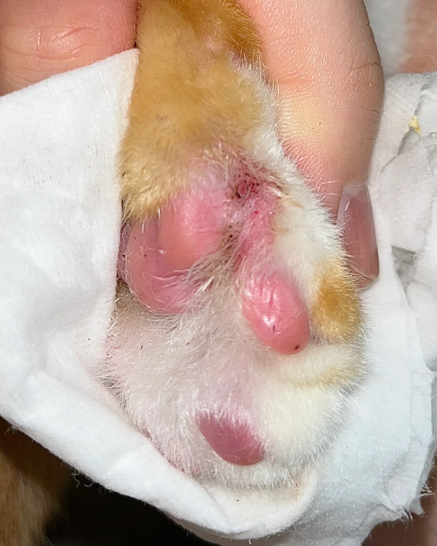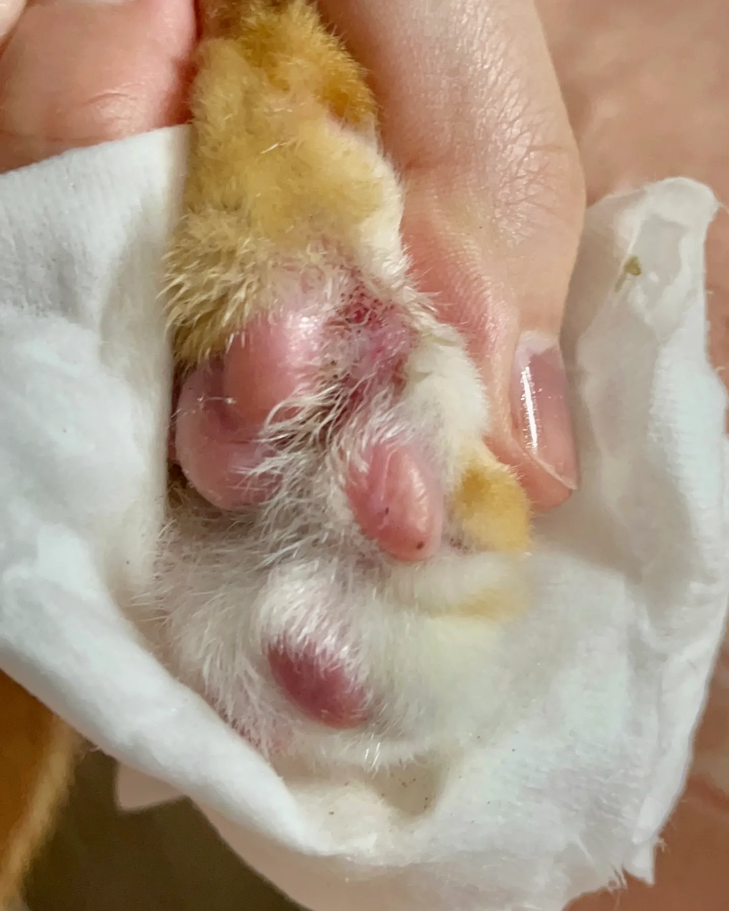 애기 발에 뭐가 묻은 것 같아서 닦다가 발견했어요 ㅠㅠ 빨갛고 닦으려고 하면 엄청 싫어하더라구요 ㅠㅠ하루빨리 병원에 가는 게 나을까요? 아니면 동물전용 연고사서 발라 놓으면 될까요ㅠㅠㅠ??